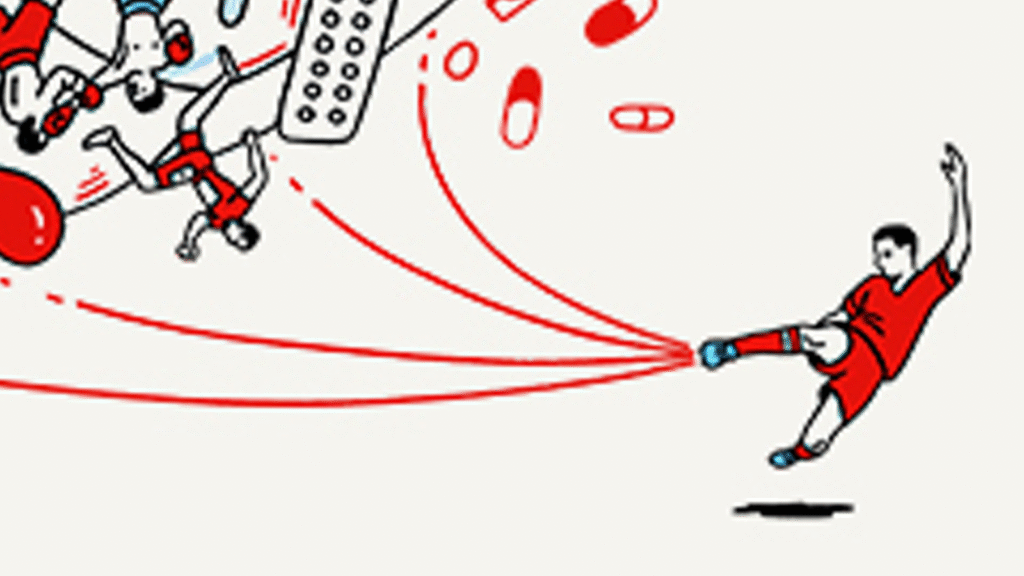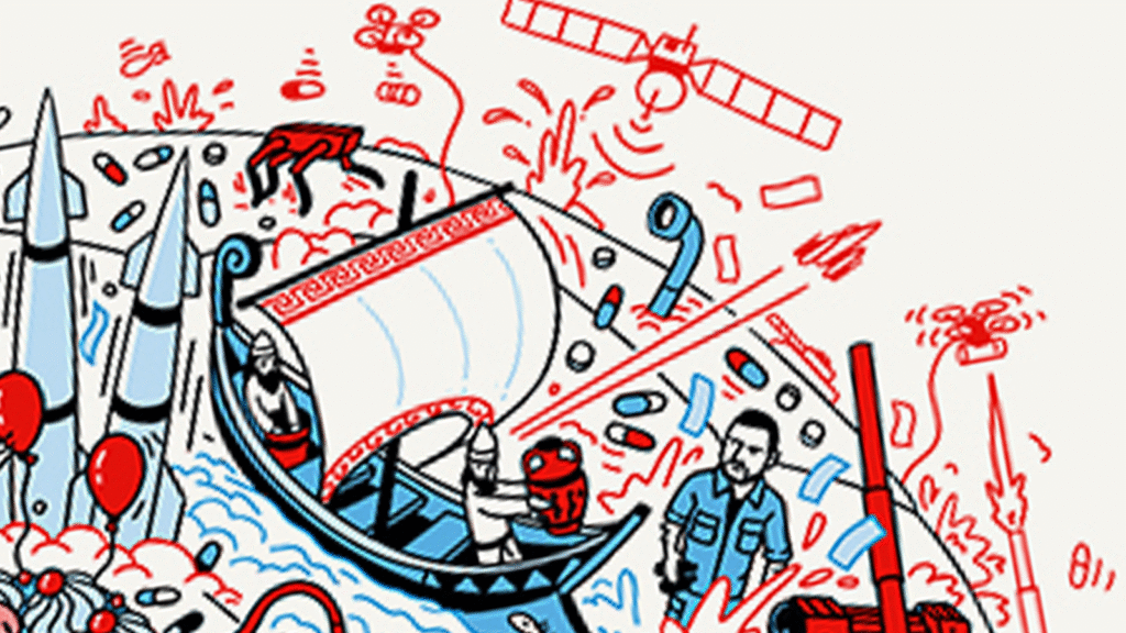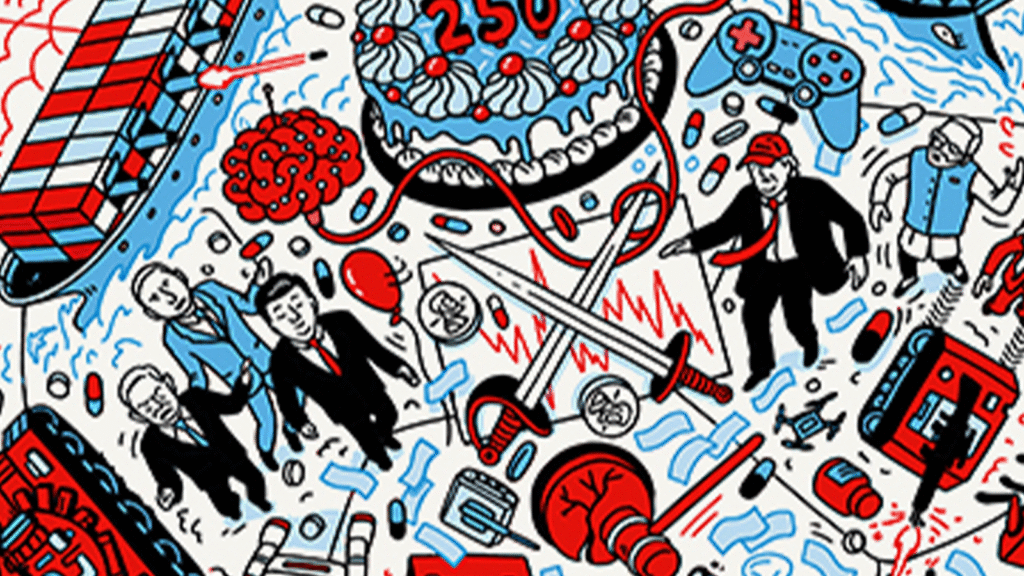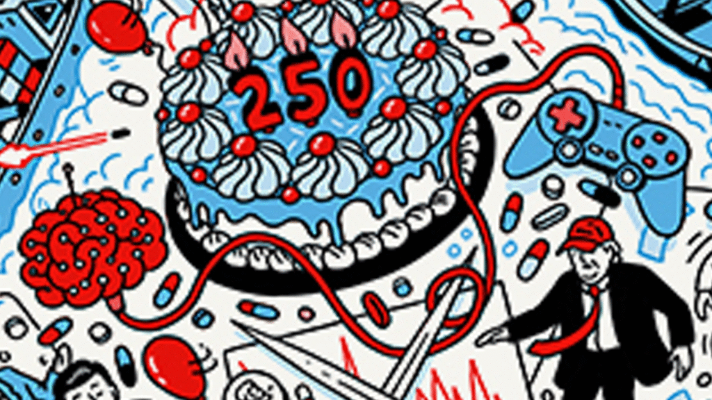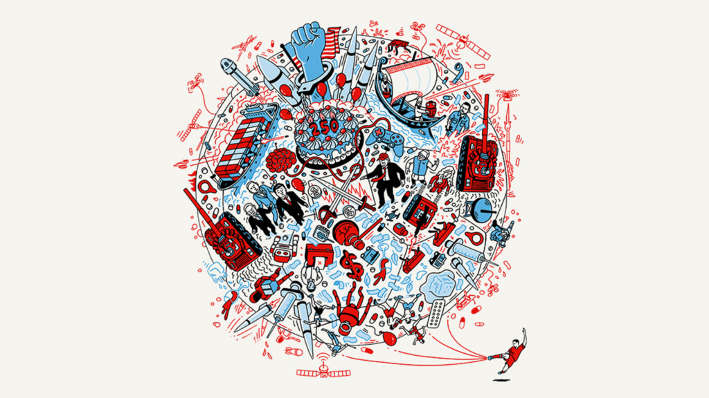 Un gâteau d’anniversaire fissuré marqué « 250 ». Un poing américain entouré de pilules bleues. Des chars russes. Des fusées chinoises. Un cerveau câblé. Une manette abandonnée. De la glace qui fond.
